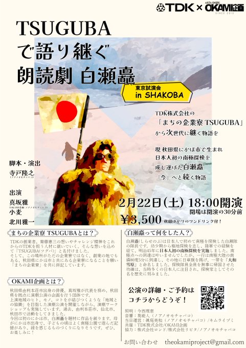 秋田県を拠点に「地域と協働する演劇」を仕掛けているOKAMI企画(オカミキカク)がプロデュースする朗読劇『TSUGUBAで語り継ぐ朗読劇 白瀬矗』がSHAKOBAで開催されます!