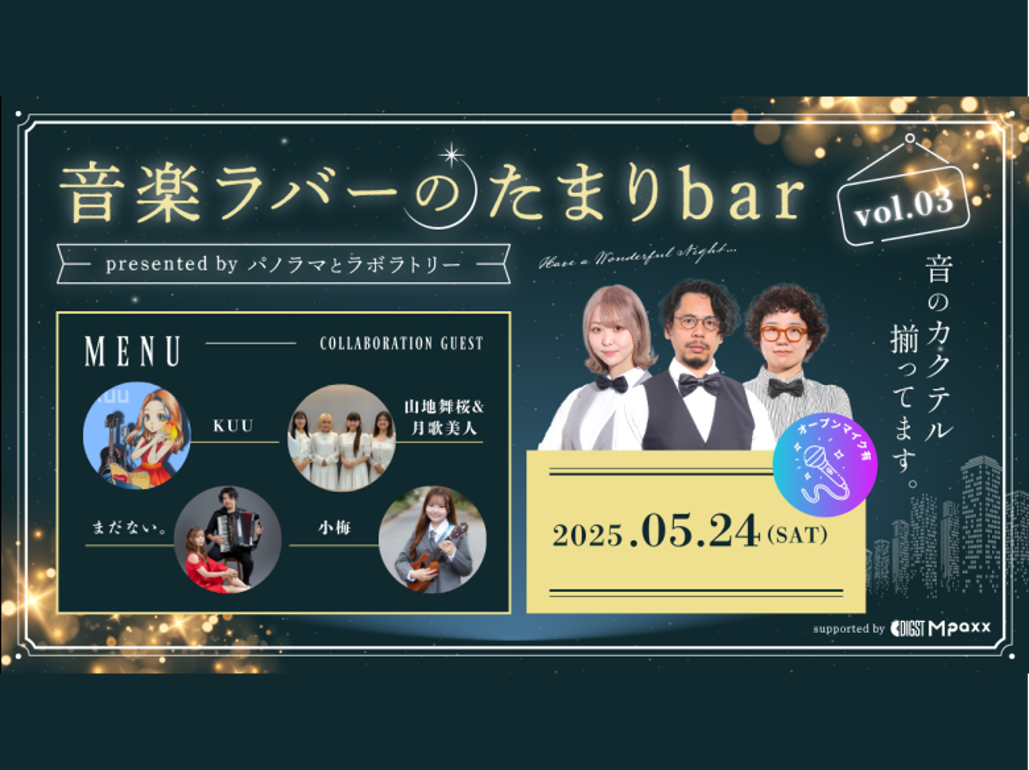 音楽ラバーのための憩いの場。 音楽好きがフラッと立ち寄って楽しめる空間を共演者と共にパノラマとラボラトリーが演出します。 日々の自分へのご褒美として歌に酔いしれる充実した一日を🎶