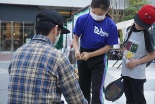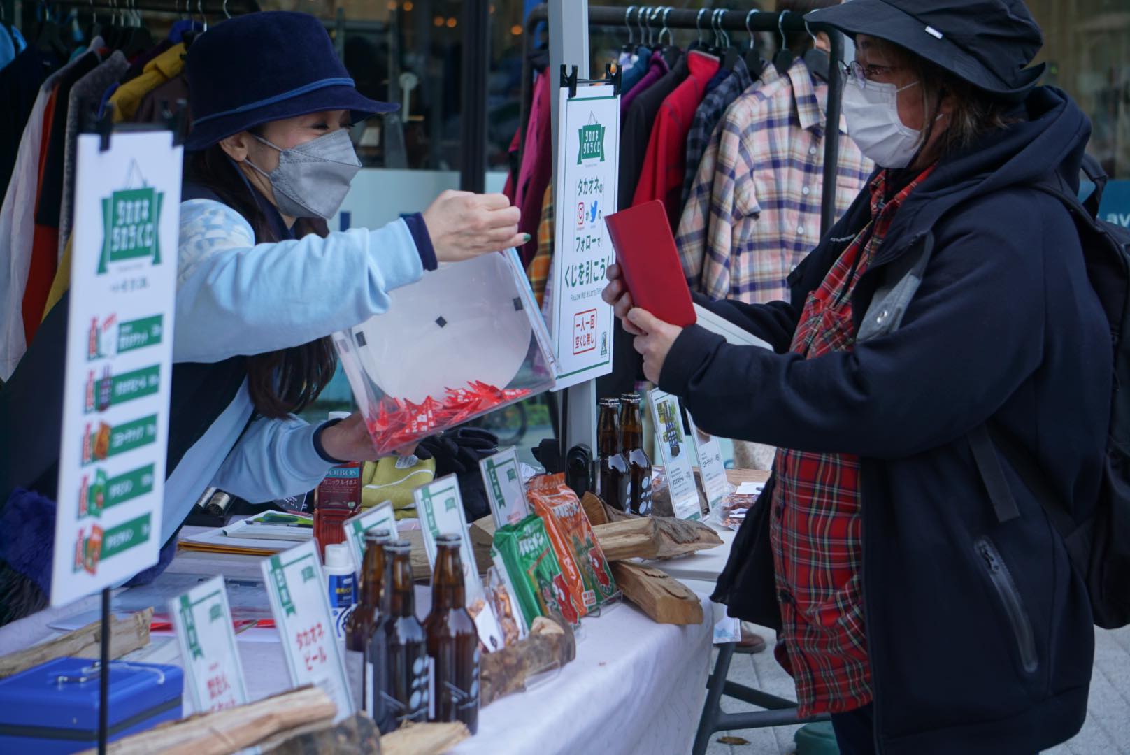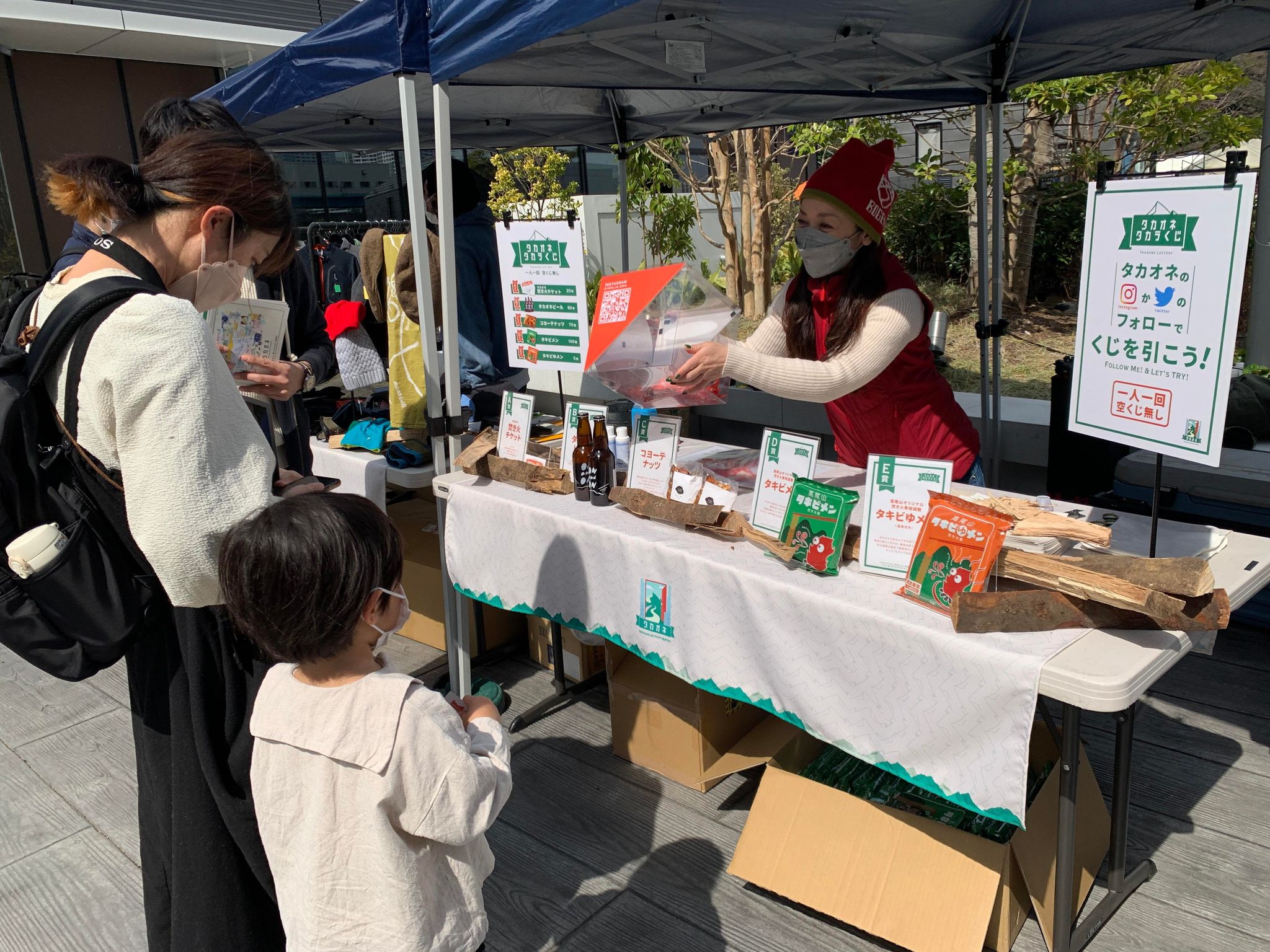 「タカオネ」の出張アウトドアブースでは薪割体験や焚き火のデモンストレーションを実施。クラフトビールなどのオリジナルグッズ、アウトドアグッズのユーズド販売も行いました。