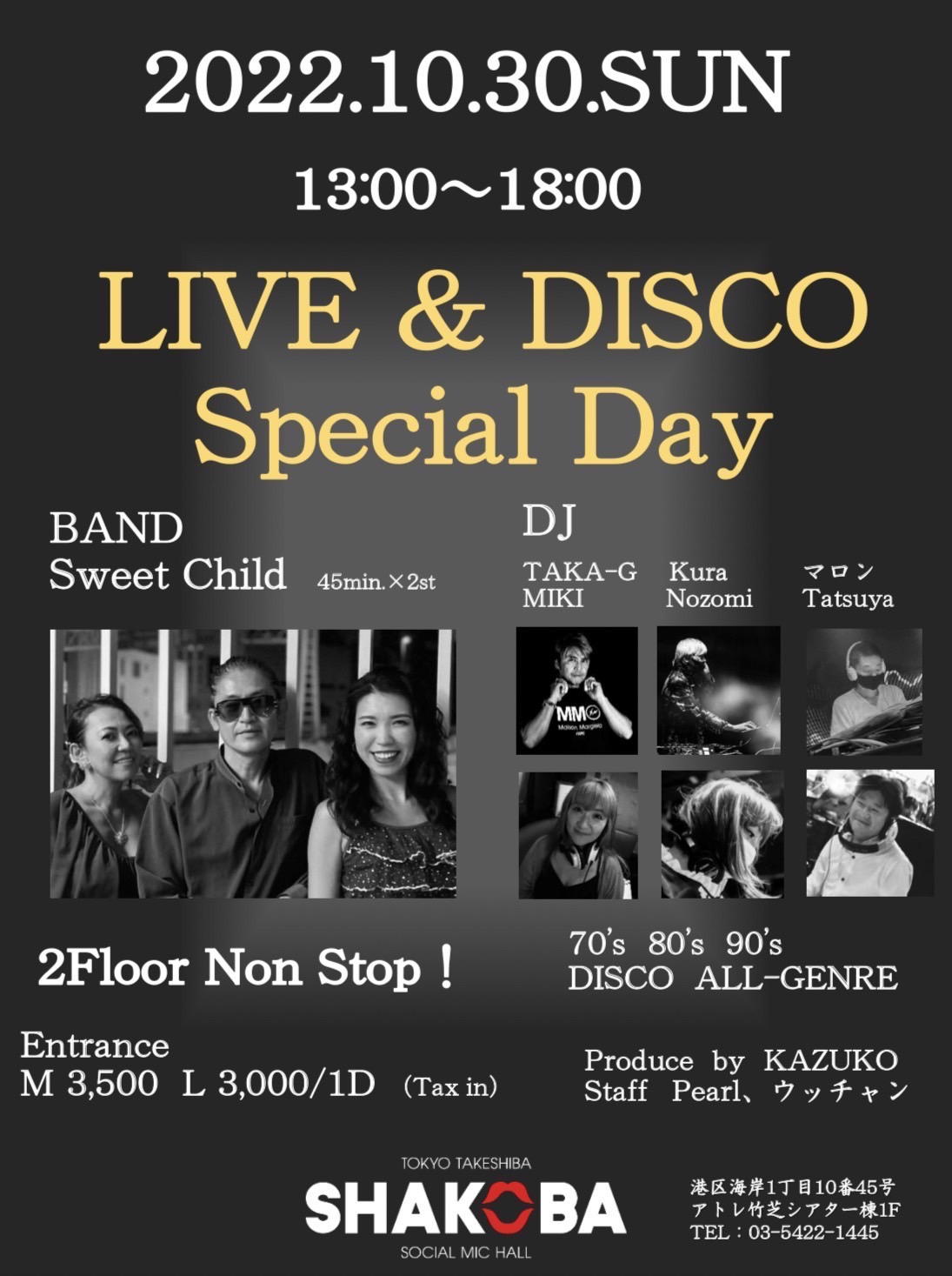 そして、TAKA-G、Kura、マロン、MIKI、Nozomi、Tatsuyaの6名のDJ陣による70年代~90年代のディスコナンバー!
